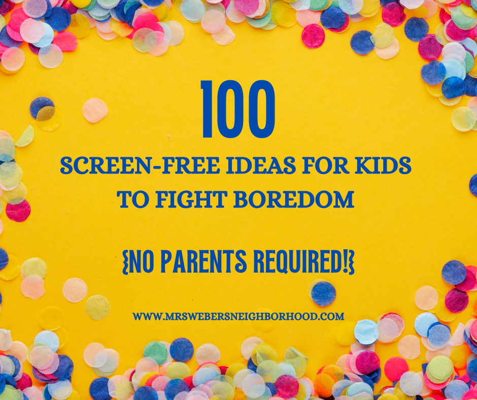 Go ahead and follow this link to a printable version of this: 100 Screen-Free Ideas For Kids To Fight Boredom