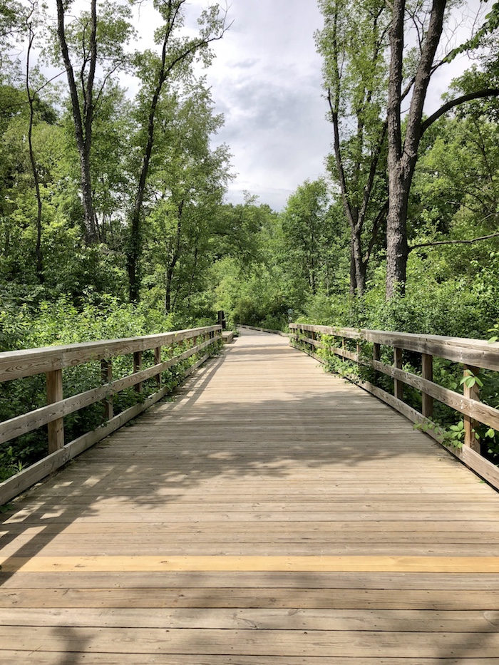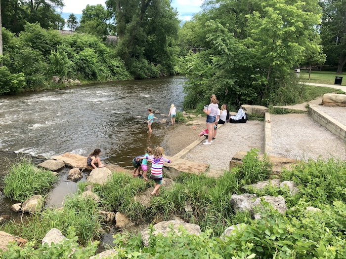 From there, you can either visit the creek area, which is down a few stairs, or walk the amazingly gorgeous boardwalk, which has 5 miles of trail along the Huron River connecting Dexter to Hudson Mills Park. My kids found several painted rocks planted along it, which they re-hid during our visit.