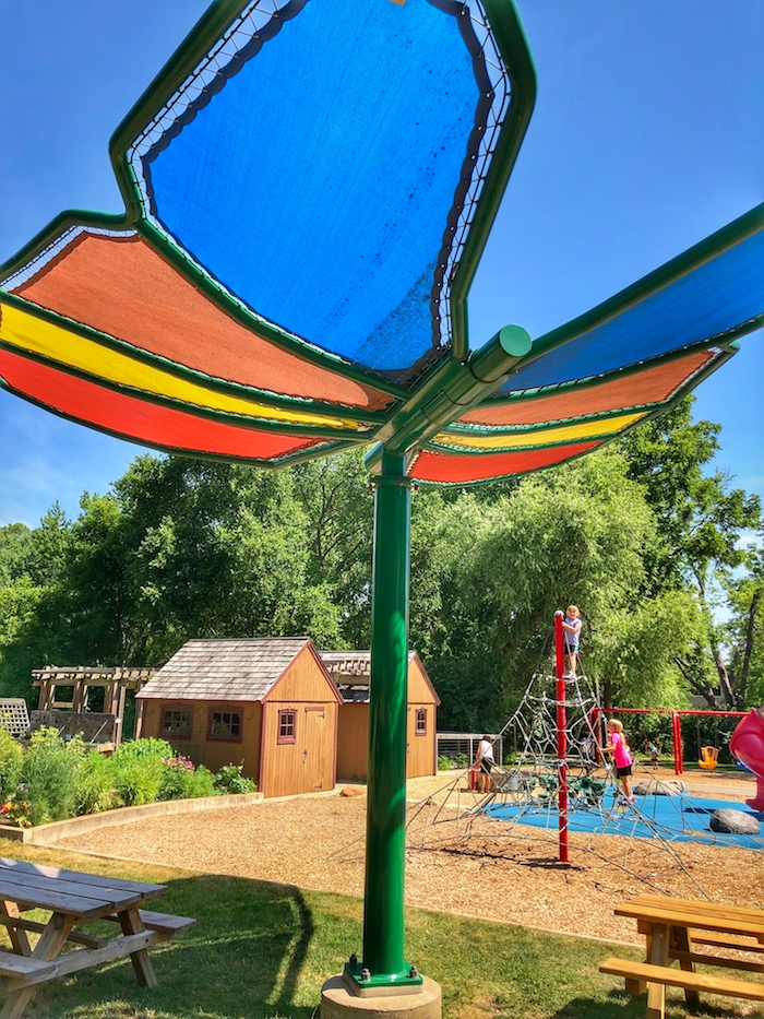 This park is the perfect spot to pack a picnic and spend a few hours. It does get a lot of morning sun, but has some really neat umbrellas in the form of a butterfly and a flower. How colorful and fun, right? It never hurts to pack some sunscreen for faces at least!